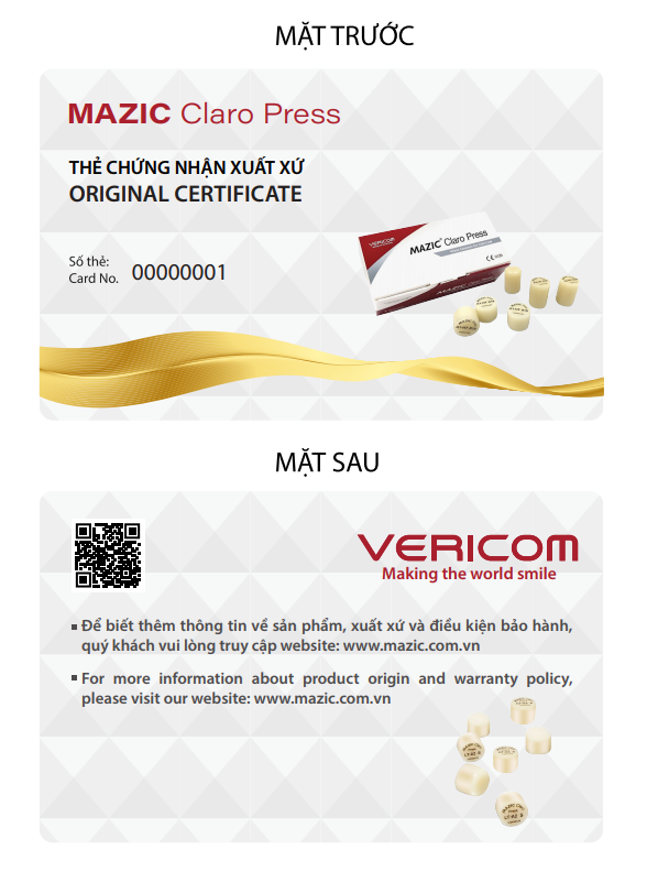 1. Phục hình Mazic Claro press được sản xuất bằng vật liệu chính hãng nhập khẩu bởi Công ty TNHH Vericom Việt Nam.